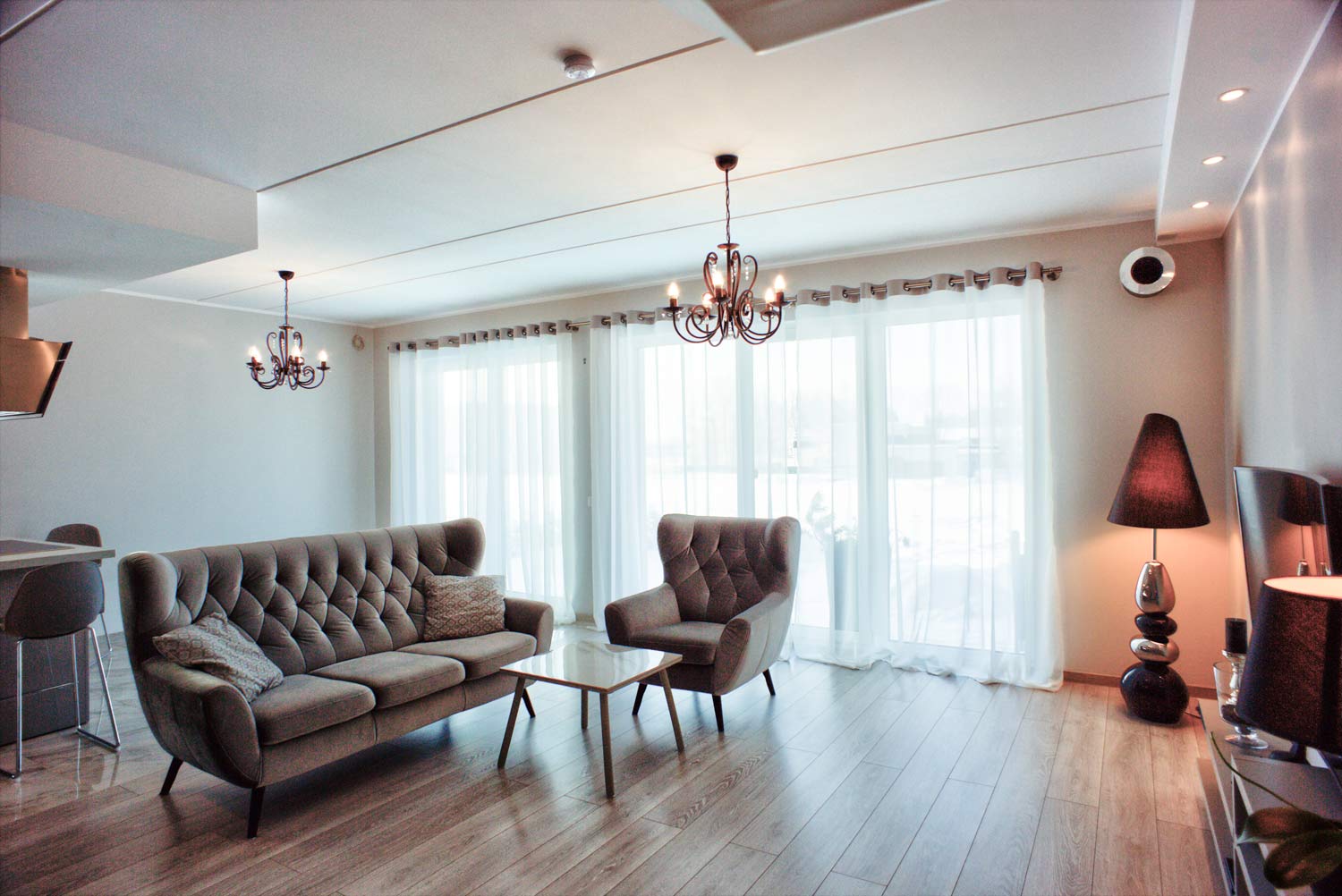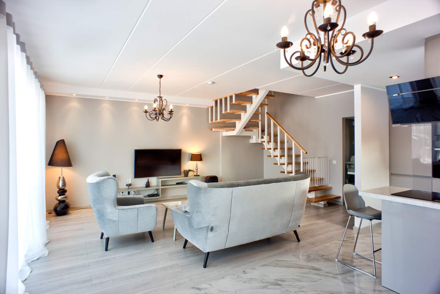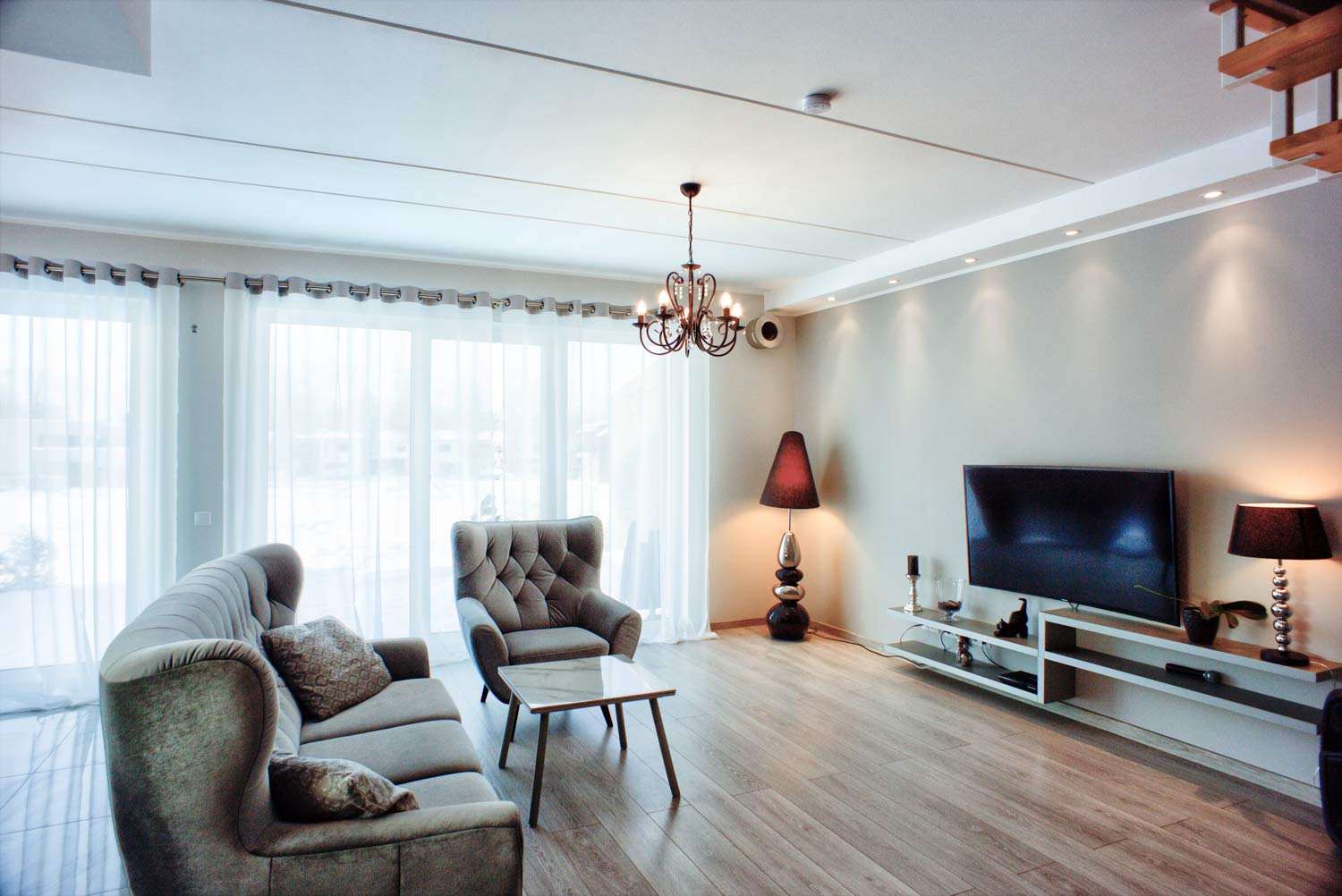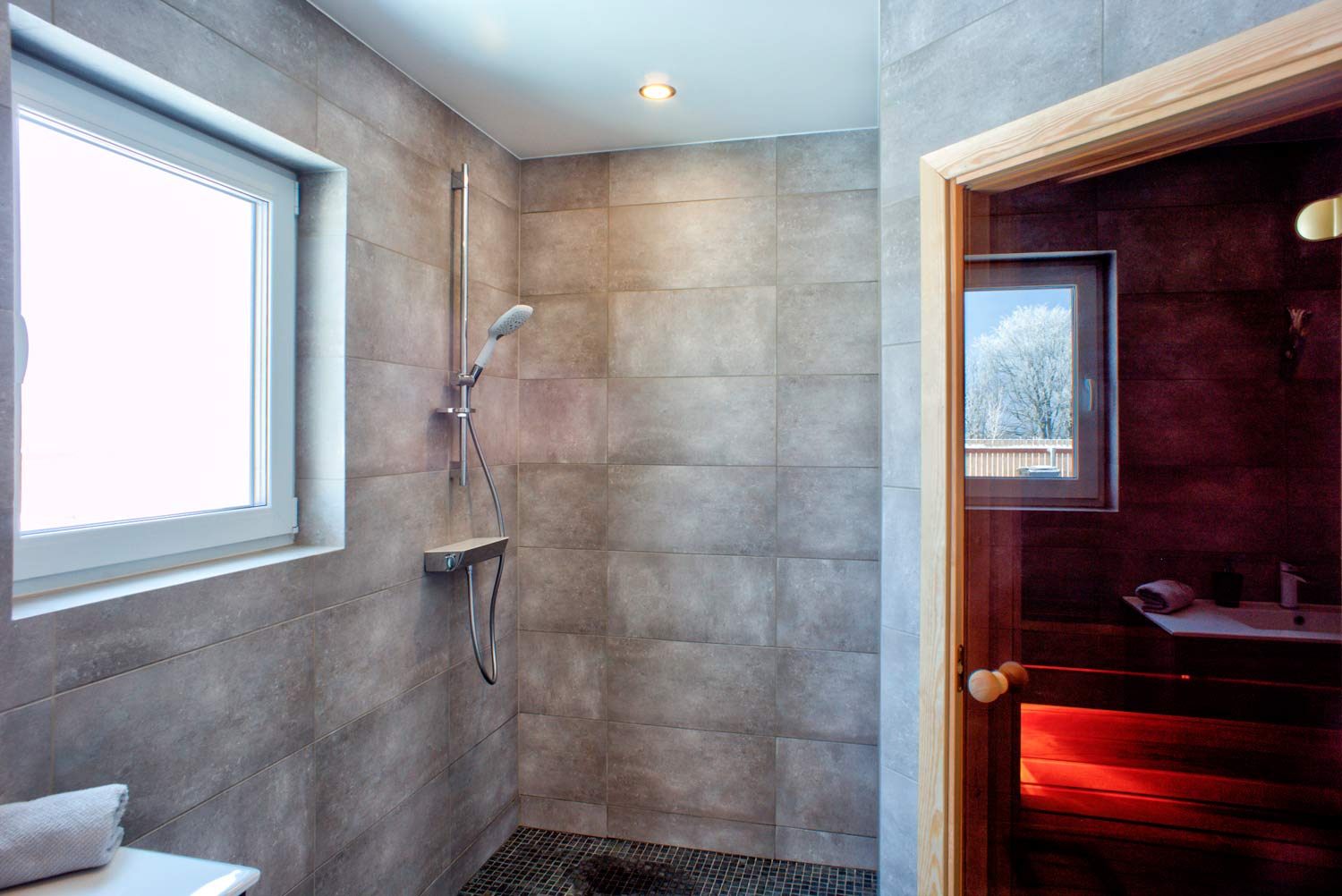 Vannitubade ja tualetruumi põrandad on kaetud keraamiliste plaatidega. Samuti on plaaditud vannitubade ja tualetruumide seinad. Laed on värvitud. Saun on välja ehitatud lava ja elektrikerisega. Eluruumides on põrandal tammespoonparkett. Köök ei kuulu hinna sisse, küll aga pakume võimalust osta seda, eraldi tasu eest (meiepoolse allahindlusega) koostöös, KRAUS KÖÖGID ga.